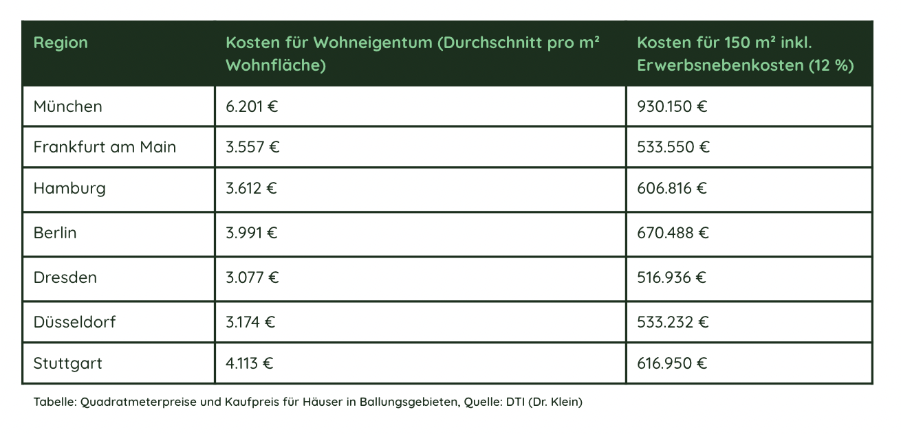 Die Lage einer Immobilie beeinflusst den Kaufpreis maßgeblich. Insbesondere Spitzenlagen in Städten wie München, Hamburg oder Berlin liegen mittlerweile deutlich über dem deutschen Durchschnitt. Die nachfolgende Tabelle veranschaulicht die Durchschnittspreise von Häusern in einigen Ballungsräumen: